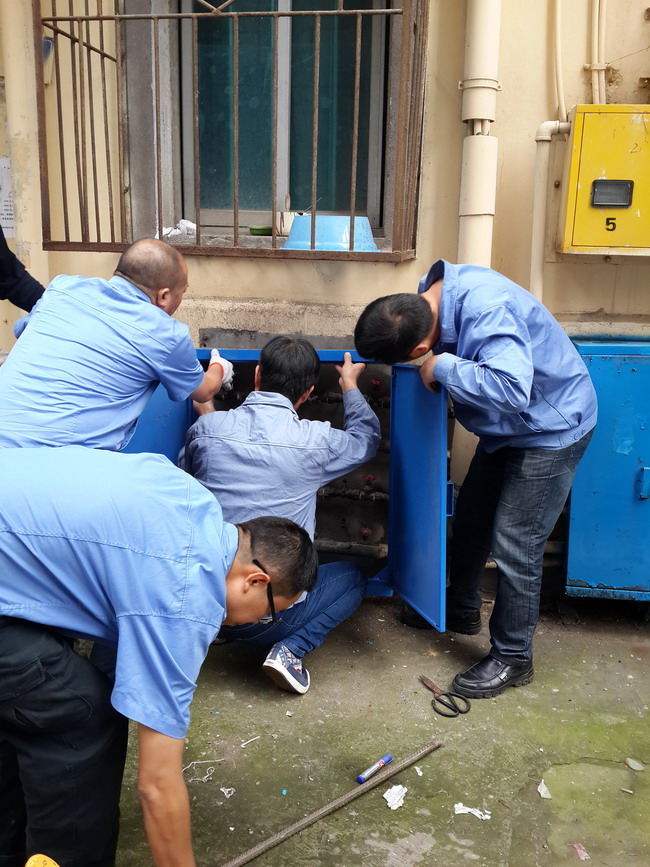 沙市植物園小區(qū)修建較早,小區(qū)里的供水表箱經(jīng)過十幾年的風(fēng)吹日曬,材質(zhì)開始銹蝕,不僅影響小區(qū)環(huán)境,也給水表保護帶來安全隱患。為扮靚城市面貌,助推“創(chuàng)衛(wèi)”工作,6月29日產(chǎn)業(yè)支部第一黨小組的黨員們來到小區(qū),在組長易繼剛的帶領(lǐng)下,首先對小區(qū)內(nèi)的舊表箱進行拆除,當天雖然下著大雨,但并沒有影響工作的開展,黨員們冒雨對銹蝕的表箱一個個拆除,并對表箱內(nèi)的水表進行清理。這些水表被居民用破舊衣物隨意包扎,由于時間較久,里面灰土沉積,黨員們彎著腰對包扎物進行了清理,同時將塵土清掃干凈,經(jīng)過一天的努力,完成了小區(qū)銹蝕表箱的拆除任務(wù)。30日,黨員們又繼續(xù)對新表箱進行了安裝,新表箱密封性較好,避免了水表的日曬雨淋,也起到防塵防凍作用。當干凈漂亮的藍色水箱整齊的懸掛在小區(qū)墻面時,引來了居民的不住稱贊。