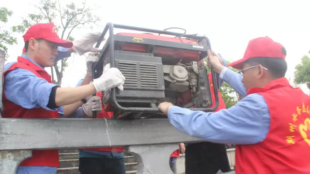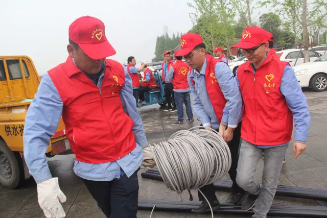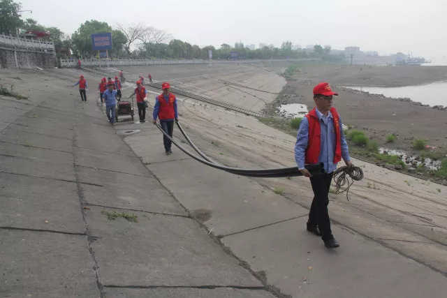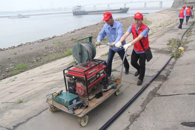 經(jīng)過(guò)前期認(rèn)真檢查和充分的準(zhǔn)備,當(dāng)天上午志愿者們頂著驕陽(yáng)開始了作業(yè)。由于維修作業(yè)需要電源,但發(fā)電機(jī)組體積大重量沉且需要翻越江岸護(hù)欄,黨員同志們團(tuán)結(jié)合作,肩扛手抬,克服重重困難,用了3個(gè)小時(shí)的時(shí)間成功完成了破損管段的修復(fù)。為確保一米線不被江水沖走,大家又對(duì)一米線加設(shè)了8根鋼絲予以加固,并對(duì)系在救生水管上的浮力輪胎進(jìn)行捆扎。加固后的“一米線”安全性能大大得到了提高。