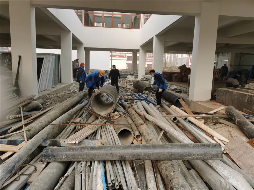 參觀完畢后,黨員們分為三組,按照計劃分別對行政樓下的材料堆場和廠區(qū)道路進行清掃整理,打造一個干凈整潔的水廠環(huán)境。黨員們有的拿起掃把鐵鍬清整道路,有的人整理材料搬運到指定位置,有的三兩一組抬板材,還有的用小拖車清運垃圾……其中最重的一項任務(wù)是轉(zhuǎn)運一個約700斤的堵板,幾個黨員聚集在一起,邊挽袖子邊商議著站定在各自便于發(fā)力的位置,一聲令下,大家齊心協(xié)力共同使勁,沉重的堵板被一步一挪慢慢移向指定地點,只見大家滿臉通紅,汗水和著灰塵凝結(jié)在臉上,身上也沾滿了厚厚的灰塵……2個小時過去了,堆場上的材料被整整齊齊地碼放到位,地上的雜物也被清理得干干凈凈??粗鴦趧映晒?,大家雖然倍感疲乏,但想著能為水廠建設(shè)盡一份綿薄之力,內(nèi)心依然非常高興。