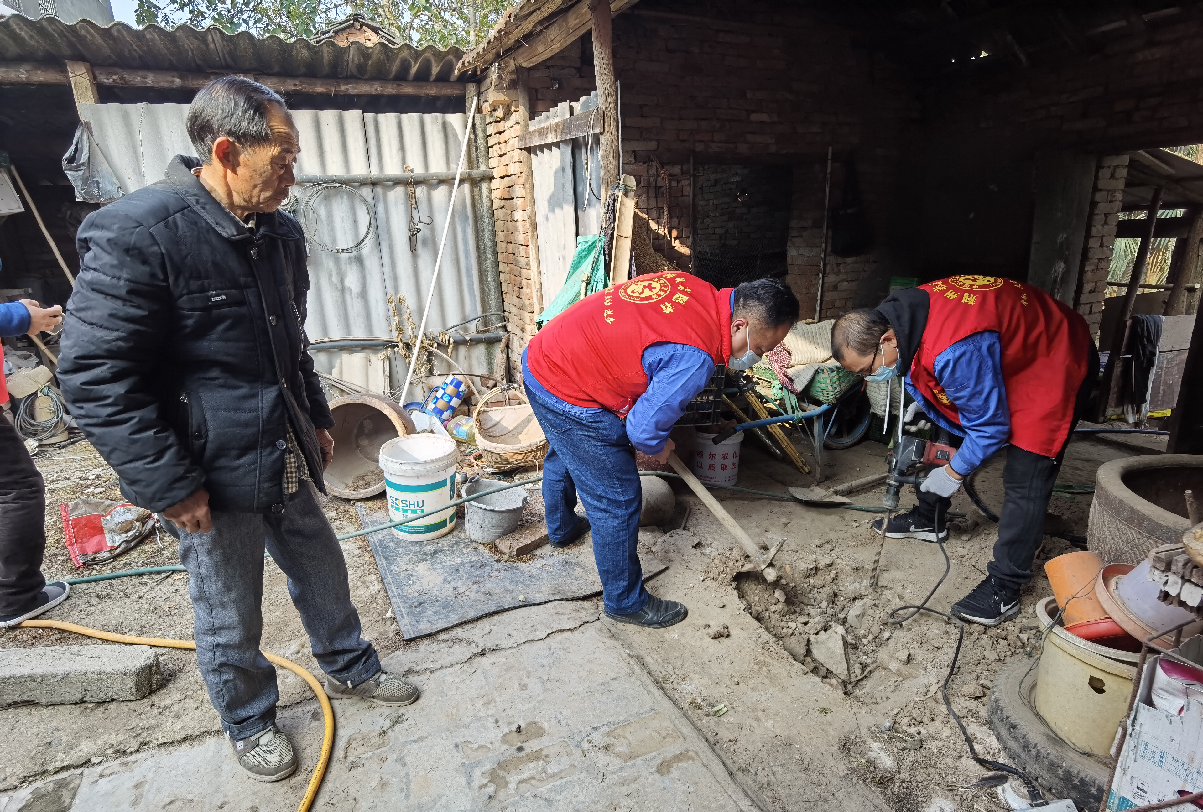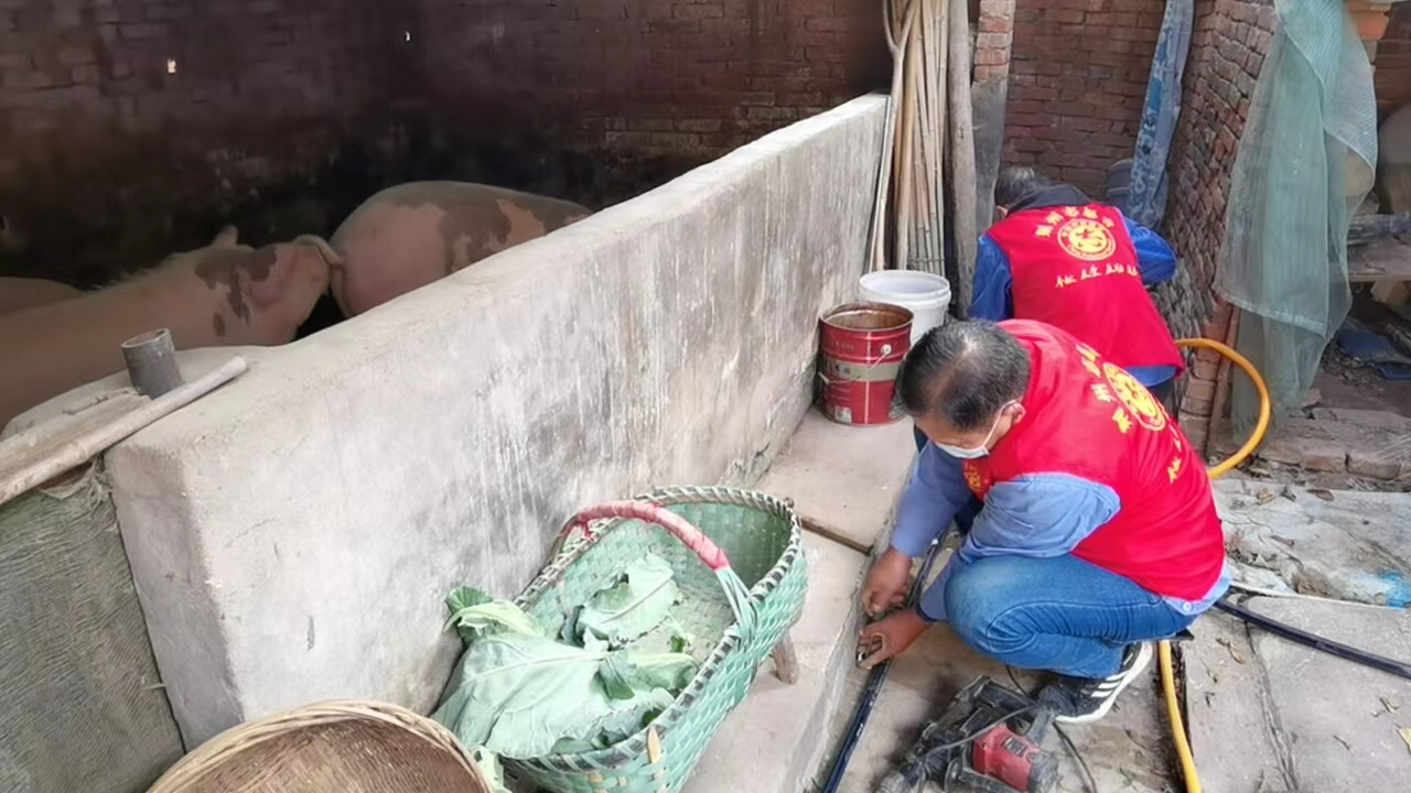 現(xiàn)場情況雖然不算復(fù)雜,但已經(jīng)被水泥硬化的路面還是給施工帶來了不小的難度,整整一個上午,前來維修的城南客服中心“三微服務(wù)志愿隊(duì)”沒有絲毫停歇,他們分頭協(xié)作,通力配合,有的人負(fù)責(zé)施工設(shè)計(jì),有的人負(fù)責(zé)材料準(zhǔn)備,有的人負(fù)責(zé)與老兩口說說話、談?wù)勑?,撫慰老人的心靈。臨近中午時,維修工作終于完成,這一次幫扶共使用PE管材18米,各類彎頭、三通等管制件十多個,設(shè)計(jì)并安裝了一條將廁所與豬圈相連的管道,為了方便老人養(yǎng)豬,還為老兩口分別接通了2個便于洗手和清洗豬圈的水龍頭,盡全力為老兩口帶來更加便利優(yōu)質(zhì)的用水服務(wù)。