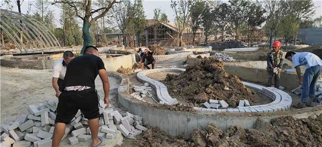 1、園路開挖及碎石回填、園區(qū)青瓦地面已經(jīng)開始鋪裝;