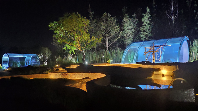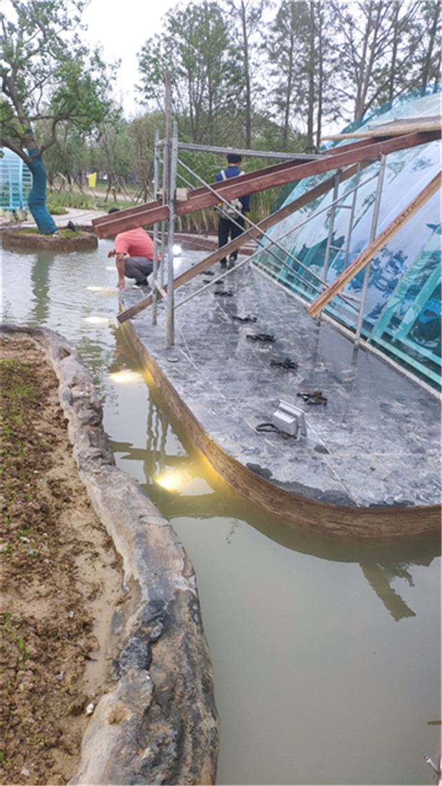 水電部分完成:安裝水底燈、射燈、草坪燈,全園燈具已安裝完畢,展廳水幕封邊安裝完畢,水幕用綠化水管試水,主泵坑安裝活動蓋板。