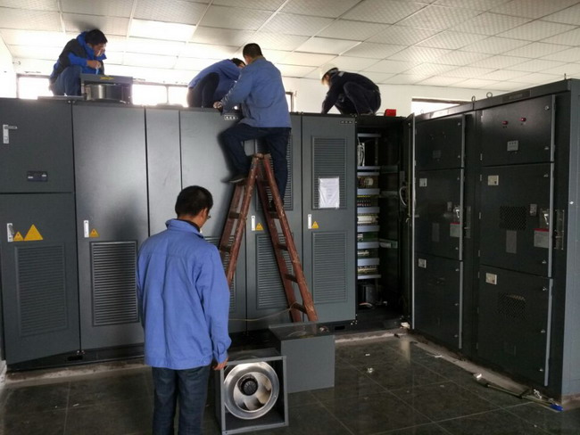 10月21日中午,從北京利德華福電氣技術(shù)有限公司發(fā)出的高壓變頻設(shè)備順利到達(dá)柳林水廠,此次安裝的高壓變頻柜體積大,質(zhì)量重,最大的一組變頻柜重達(dá)3噸,加之5噸重型叉車無法進(jìn)入二泵房室內(nèi),給設(shè)備的安裝造成了極大的困難。為此,在曾總、王廠長(zhǎng)的帶領(lǐng)下,集結(jié)全廠機(jī)電強(qiáng)兵,根據(jù)以往大型設(shè)備安裝的經(jīng)驗(yàn),制定出采用移動(dòng)鋼軌和小型叉車相結(jié)合的方式,使用全體維修人員的人力,將6噸多重的四臺(tái)高壓變頻柜移至二泵房高壓柜底座上。這一系列工作十分繁重,在不增加費(fèi)用,不依靠外力的前提下,機(jī)電人員不惜加班加點(diǎn),連續(xù)作戰(zhàn),表現(xiàn)出強(qiáng)烈的主人翁意識(shí)和責(zé)任感。