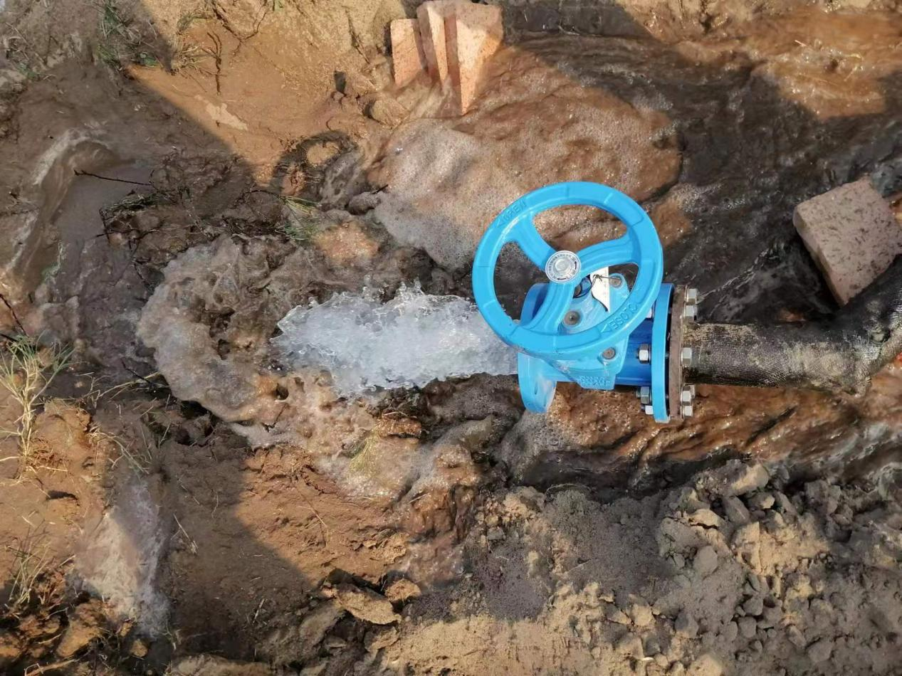2022年11月15日,太陽(yáng)的余輝剛剛露出來(lái),施工人員就已整裝待發(fā),迅速趕往施工現(xiàn)場(chǎng)。在與用戶現(xiàn)場(chǎng)溝通,確認(rèn)管位后,立即按圖施工。因場(chǎng)地限制,不能動(dòng)用大型器械,只能人工開(kāi)挖溝槽井位。工人們揮舞著洋鎬,鐵楸奮力的開(kāi)挖著腳下堅(jiān)硬的黃土。有些寒意的初冬清晨,工人們?cè)缫衙摰袅送馓?,額頭滲出了汗水。在工人輪番接力的努力下,溝槽終于成型。安裝上管卡,發(fā)動(dòng)發(fā)電機(jī),隨著鉆孔機(jī)的轟鳴聲,入水接口成功的從DN300球管上開(kāi)鑿。隨后墊沙,組裝水表、配件,安裝管道。隨著娟娟細(xì)流從閘閥流出,工人們的臉上終于露出了一絲微笑,這才有空拂去額頭的汗水。