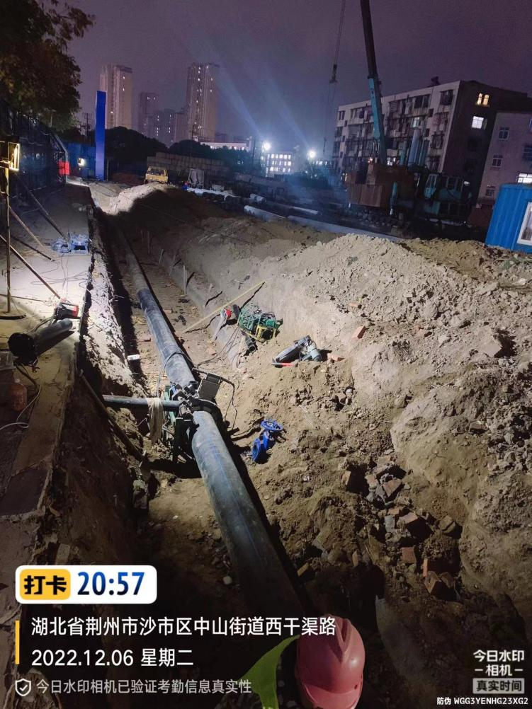 冬日深夜,寒意逐漸侵襲,氣溫已逼近0度,鋼制管件比平日里更為冰冷,仿佛所有物體都凝固了似的;作業(yè)就緒,夜間施工照明燈的閃耀與機械操作的聲音打破了深夜清冷街道的寧靜,施工員們采取保暖措施,連夜加班加點齊奮戰(zhàn)、攻堅克難,始終以飽滿的工作激情堅守在施工現(xiàn)場。在所有人的不懈努力下,21:00 PE管熱熔焊接完成,00:30余水排盡開始管道接頭,4:00開始管道沖洗……清晨5:30夜色逐漸褪去,在城市蘇醒前,管改遷移工程全部完成。