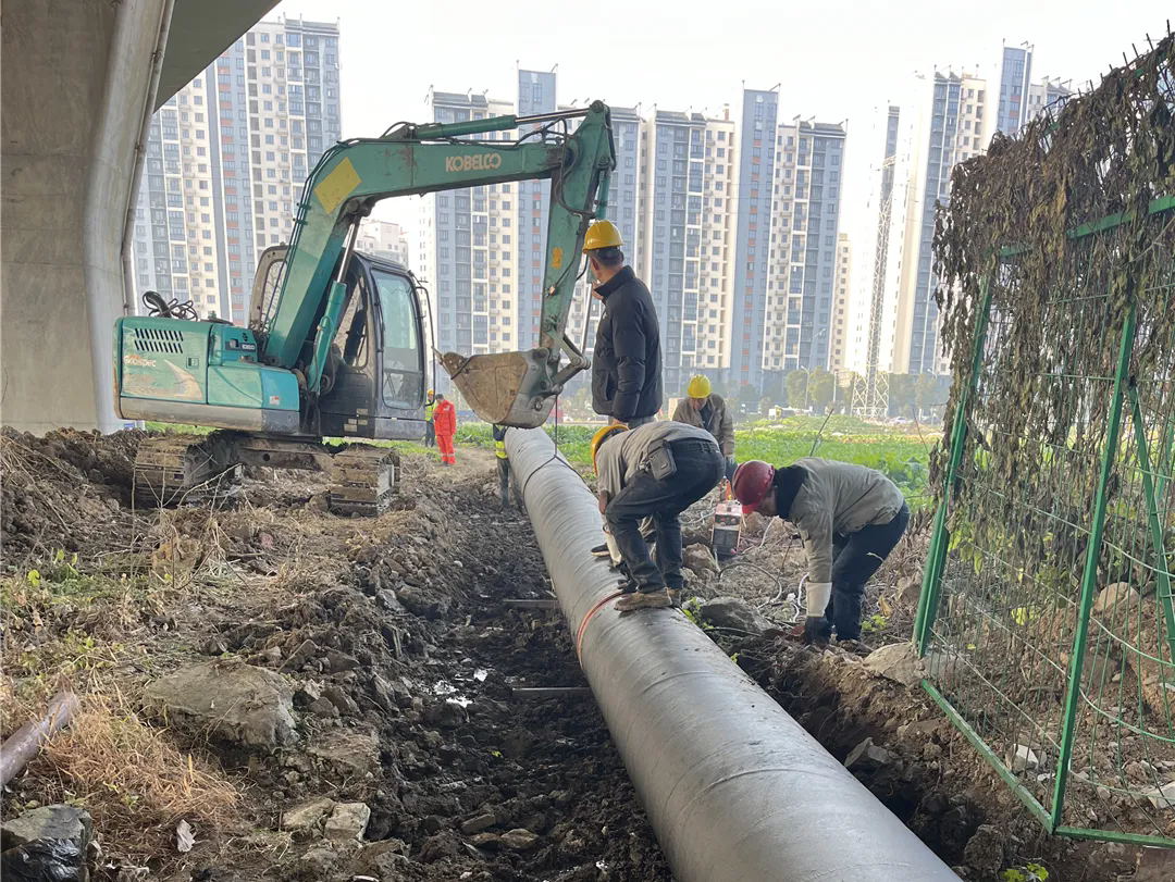 武德路全段長約7.2Km,DN800mm管道2.1Km,DN600mm管道5.1Km,2019年開始施工,2024年5月全線完工,在集團公司領(lǐng)導(dǎo)的大力支持和指導(dǎo)下,歷時5年時間,終于全線貫通。該項目其中有2.6Km為老城區(qū),且地下管線復(fù)雜,沿線有商業(yè)門面,協(xié)調(diào)難度大,施工難度大;4.4Km為新建道路配套工程,需根據(jù)道路施工進度實施,穿越鐵路,高速公路,荊沙河、太湖港等施工難度特別大。該工程分為四段分期施工,其中:一標(biāo)段:武德路與金龍路交叉口至318國道(景明觀路)DN800mm管網(wǎng)2.1Km;二標(biāo)段:318國道(景明觀路)至荊沙大道DN600mm管網(wǎng)0.55Km;三標(biāo)段:荊沙大道至高鐵DN600mm管網(wǎng)2.0Km;四標(biāo)段:高鐵至高陽大道DN600mm管網(wǎng)2.4Km。