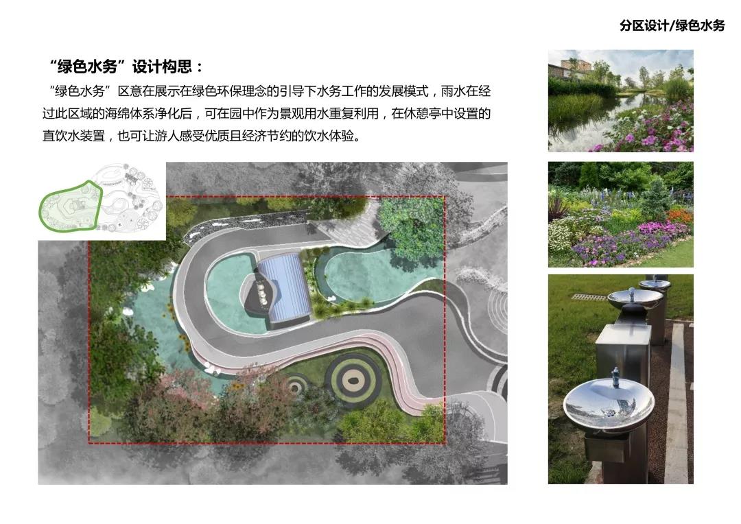 生態(tài)水務(wù)區(qū):意在展示在綠色環(huán)保理念的引導(dǎo)下水務(wù)工作的發(fā)展模式,雨水在經(jīng)過(guò)此區(qū)域的海綿體系凈水后,可在園中作為景觀用水重復(fù)利用,在休憩亭中設(shè)置的直飲水裝置,也可讓游人感受優(yōu)質(zhì)且經(jīng)濟(jì)節(jié)約的飲水體驗(yàn)。
