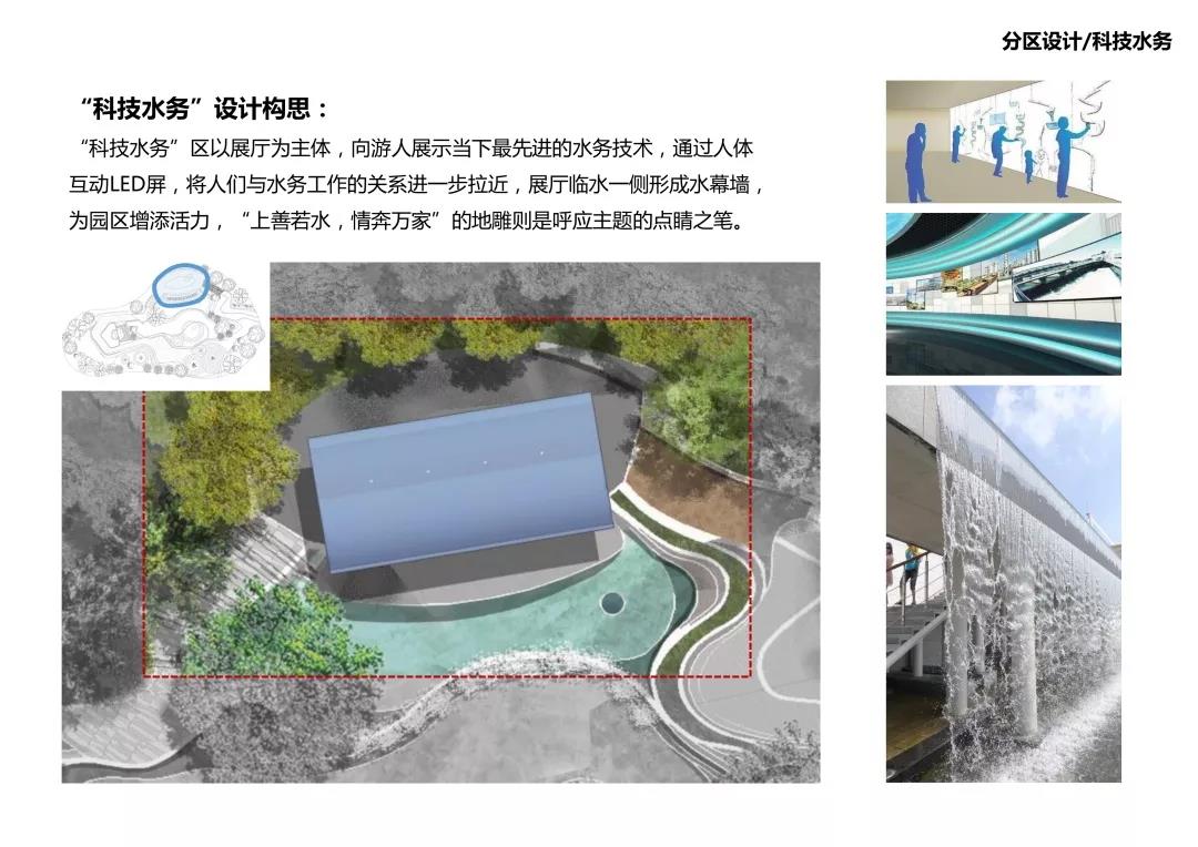 科技水務(wù)區(qū):以展廳為主體,向游人展示當(dāng)下最先進(jìn)的水務(wù)技術(shù),將人們與水務(wù)工作的關(guān)系進(jìn)一步拉近,展廳臨水一側(cè)形成水幕墻,為園區(qū)增添活力,“上善若水,情奔萬(wàn)家”的地雕則是呼應(yīng)主題的點(diǎn)睛之筆。