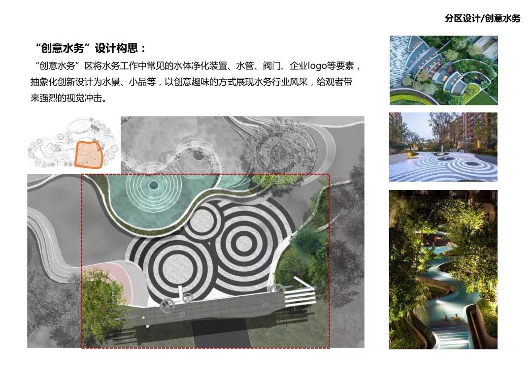 創(chuàng)意水務(wù)區(qū):將水務(wù)工作中常見(jiàn)的水體凈化裝置、水管、閥門、企業(yè)logo等要素,抽象化創(chuàng)新設(shè)計(jì)為水景、小品等,以創(chuàng)意趣味的方式展現(xiàn)水務(wù)行業(yè)風(fēng)采,給觀者帶來(lái)強(qiáng)烈的視覺(jué)沖擊。