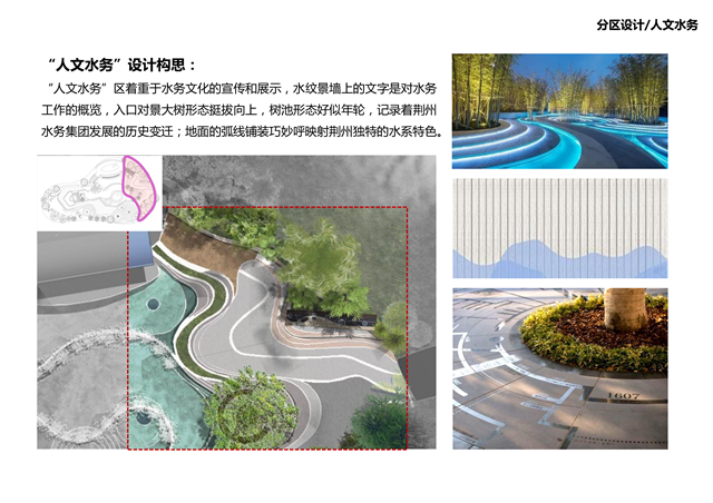 人文水務(wù)區(qū):著重于水務(wù)文化的宣傳和展示,水紋景墻上的文字是對(duì)水務(wù)工作的概覽,入口對(duì)景大樹(shù)形態(tài)挺拔向上,樹(shù)池形態(tài)好似年輪,記錄著荊州水務(wù)集團(tuán)發(fā)展的歷史變遷;地面的弧線鋪裝巧妙映射出荊州獨(dú)特的水系特色。