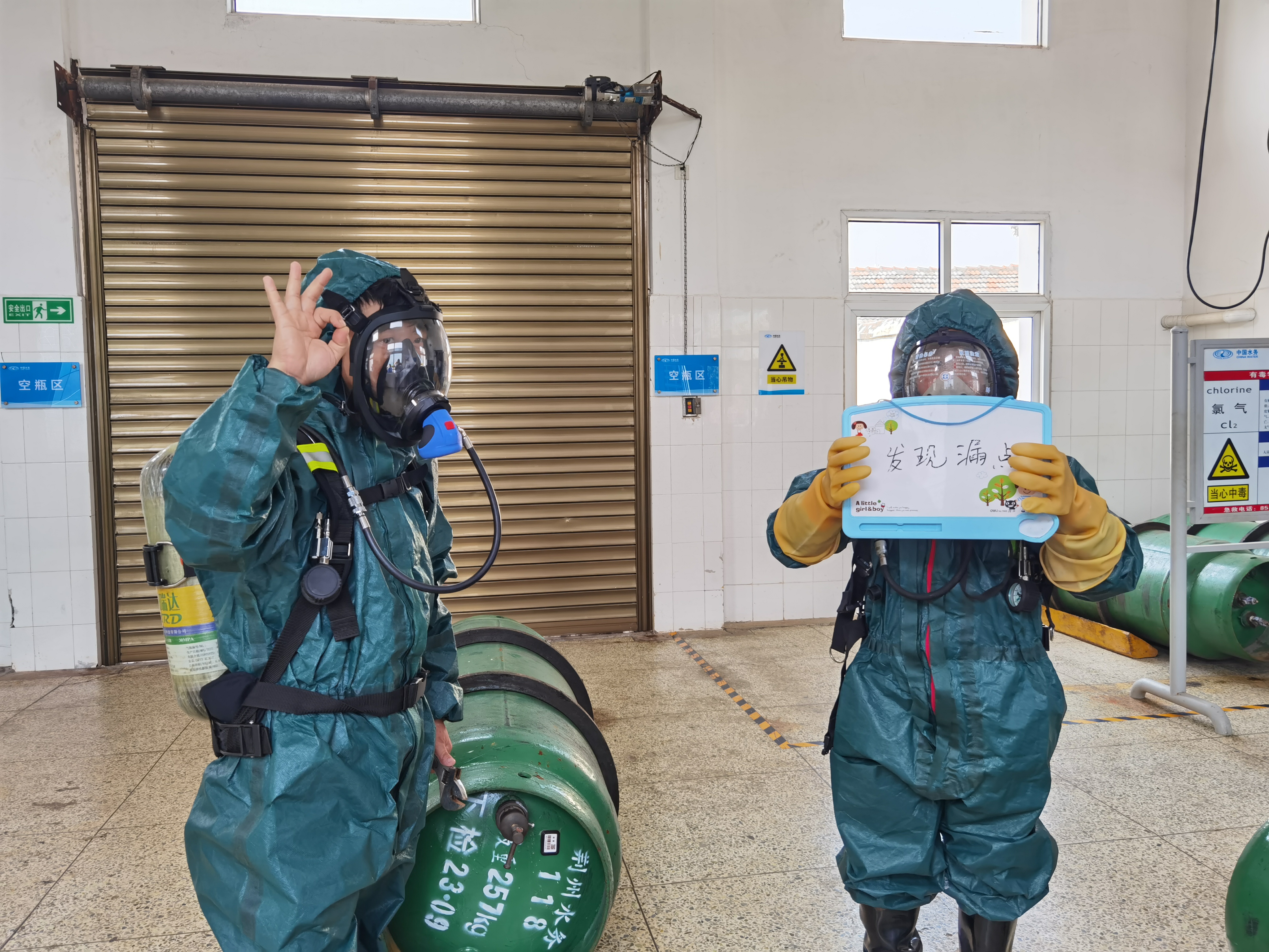 6月26日上午9時,荊州水務(wù)集團(tuán)南湖水廠投氯車間突然傳出警報聲,現(xiàn)場值班人員緊急排查,發(fā)現(xiàn)投氯車間內(nèi)用于消毒的氯氣發(fā)生了泄漏!水廠值班人員迅速將險情上報,南湖水廠廠長立即啟動應(yīng)急預(yù)案,在現(xiàn)場發(fā)出搶險指令,搶險組、配合組、疏散組、救護(hù)組迅速投入應(yīng)急搶險行動中:封鎖現(xiàn)場、疏散人員、設(shè)置警戒線,開啟車間內(nèi)泄氯吸收裝置,應(yīng)急搶險人員穿戴重型防護(hù)裝備進(jìn)入氯庫查找確認(rèn)泄漏點(diǎn),采取相應(yīng)措施及時堵住泄漏點(diǎn),對泄漏氯瓶實施無公害化處理。在現(xiàn)場險情得到控制后,氯氣濃度經(jīng)檢測已降至安全范圍,搶險指揮宣布漏氯應(yīng)急預(yù)案解除,水廠馬上恢復(fù)正常生產(chǎn),整個過程僅持續(xù)十分鐘。