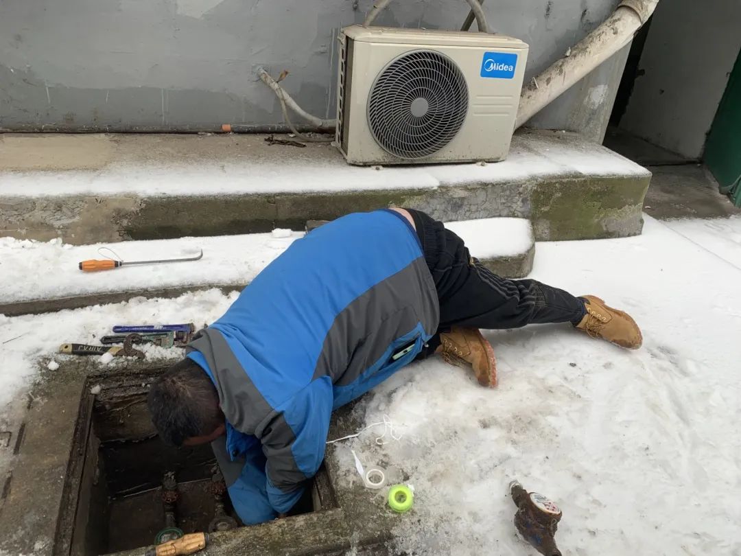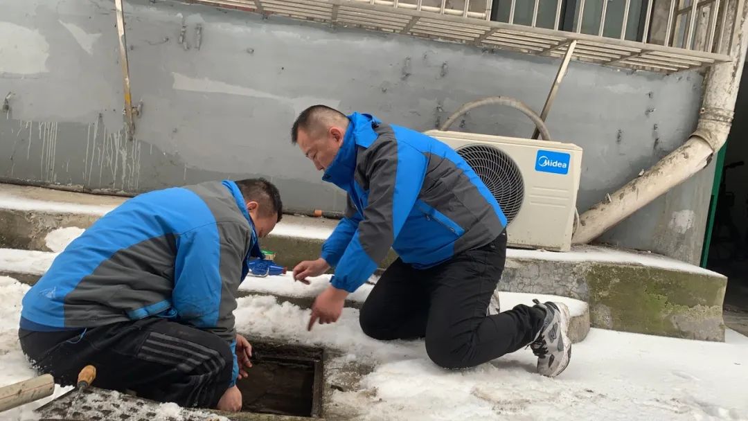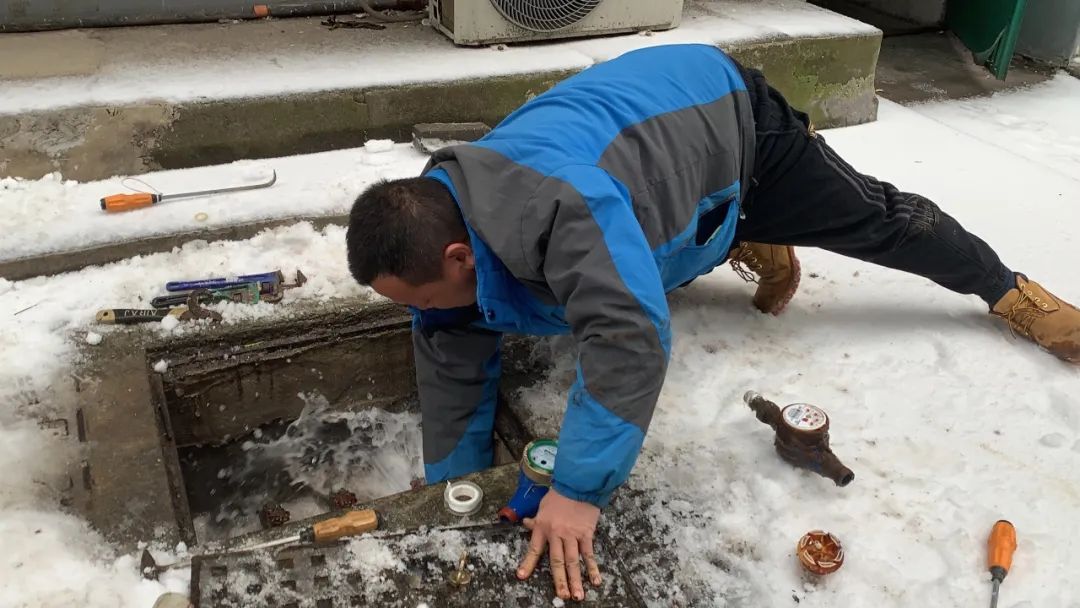 水表箱位于小區(qū)北風(fēng)口處,水表玻璃面板已經(jīng)凍破,水從破損的表面和閥門連接處噴涌出來,只見陳勁鵬師傅單膝跪地,彎腰下俯用扳手快速地扭動著水表接口,刺骨的水花四處噴射,陳師傅臉上、衣服上、袖口上濺濕的水花,在低溫的戶外瞬間結(jié)成了薄薄的一層冰花。水表拆下來后李剛師傅趕緊遞上新的水表,陳師傅快速進(jìn)行安裝,在兩位師傅默契的配合和嫻熟的操作下,水表裝上了,閥門打開了,用戶家中通水了。而師傅們的雙手因為全程浸泡在冰冷刺骨的雪水中,早已被凍得通紅失去知覺,跪地下俯的雙腿也已麻木難行。當(dāng)問到陳師傅冷不冷時,陳師傅感慨的說:“雖然身上冷,但心里是熱的”。