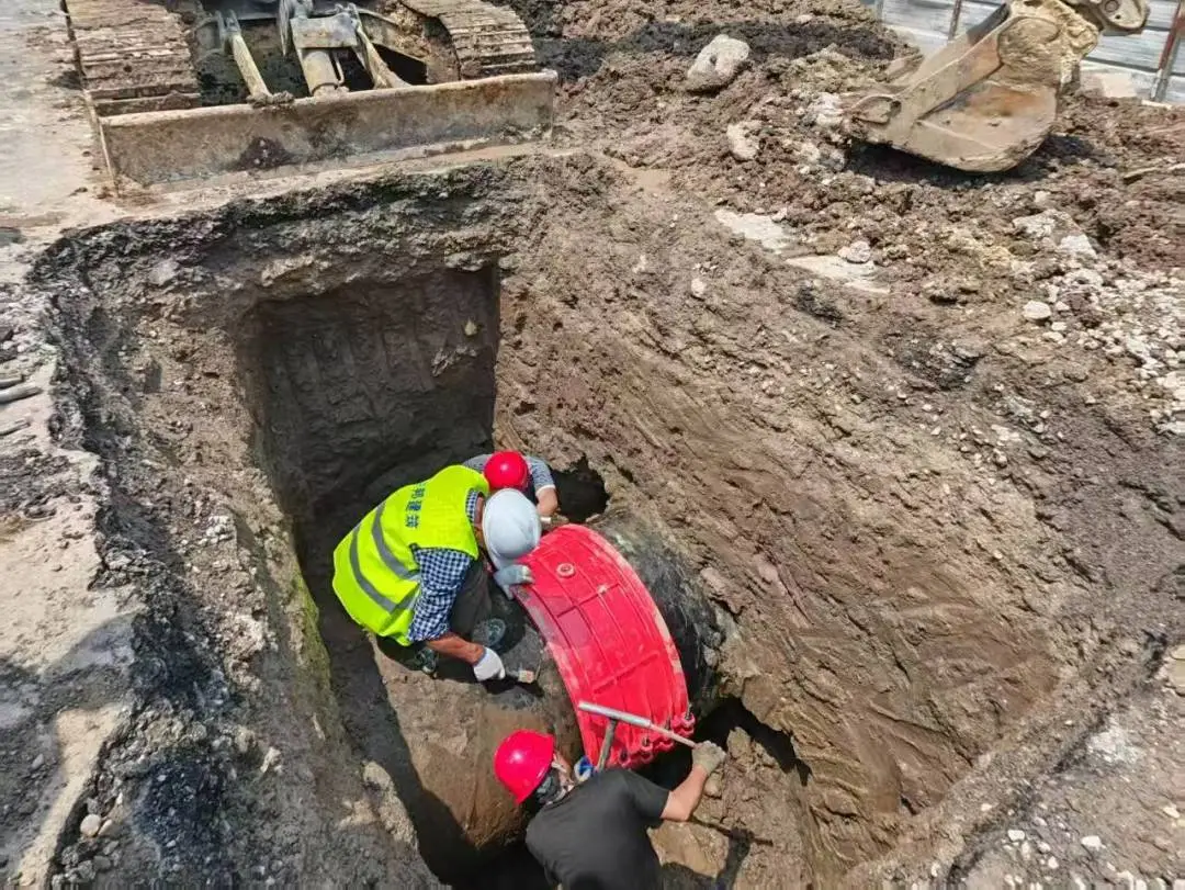 由于爆管位置特殊,管徑大,開挖作業(yè)坑基面積大,且周圍環(huán)境復(fù)雜,給搶修工作帶來了極大的困難。搶修人員不畏艱難,連續(xù)施工不停歇,在現(xiàn)場(chǎng)爭(zhēng)分奪秒地進(jìn)行搶修。最終于4月20日下午2點(diǎn)前完成了全部搶修任務(wù),僅僅只停水4個(gè)小時(shí)就恢復(fù)了供水,創(chuàng)造了維修同口徑管道用時(shí)最短的記錄。