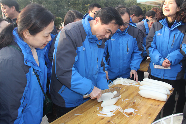 12日下午2:00,荊州水務(wù)集團(tuán)郢都水廠的廣場(chǎng)上人流涌動(dòng),熱鬧非凡。比賽臺(tái)上擺放著員工們準(zhǔn)備的蘿卜、黃瓜、韭菜、金針菇和各類肉串,食品種類繁多,讓人垂涎欲滴。本次比賽由四個(gè)分工會(huì)推選的40多名員工參加,設(shè)置的比賽項(xiàng)目有切蘿卜、穿烤串和包餃子。比賽前,常務(wù)副總經(jīng)理唐志國(guó)代表公司工會(huì)致開(kāi)幕詞,幽默風(fēng)趣的一句“比賽不要太拼命,安全第一”引得全場(chǎng)歡笑一片。