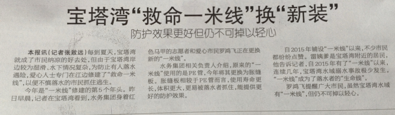 7月,長江進(jìn)入主汛期,為防止荊江寶塔灣江段游人溺水身亡事件發(fā)生,7月10日,荊州水務(wù)集團(tuán)青年志愿者對(duì)寶塔灣江邊400米長“救命一米線”進(jìn)行了維護(hù)升級(jí)。