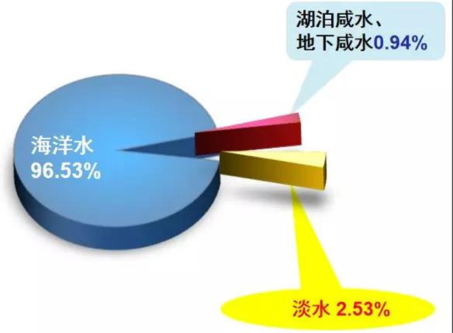 地球表面海洋咸水資源占據(jù)97.47%,淡水資源僅占2.53%。在有限的淡水資源中,我們通常人類可以真正直接利用的地下水、湖泊淡水和河床水,三者總和占比不到總淡水資源量的0.01%。