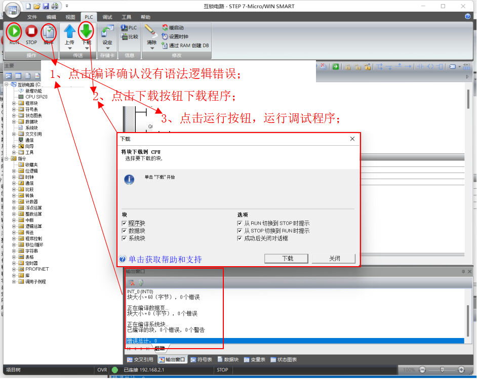 PLC程序編程完成后,(1)首先要編譯(如圖六所示),沒有問題了才能進(jìn)行后面步驟;(2)然后再點(diǎn)擊下載按鈕,下載程序;(3)運(yùn)行程序,根據(jù)運(yùn)行情況調(diào)試程序。