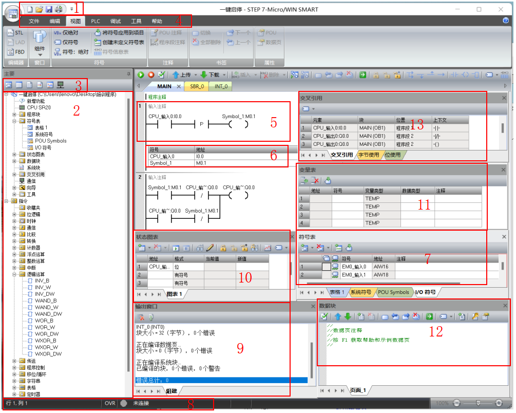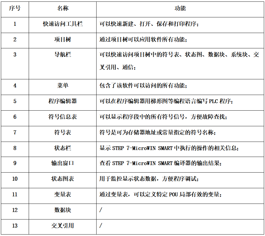 一、編程軟件界面功能介紹 S7-200smartPLC的編程軟件是STEP 7-MicroWIN SMART,提供了一個(gè)用戶友好的環(huán)境,供用戶開發(fā)、編輯和監(jiān)視控制應(yīng)用所需的邏輯。頂部是常見的任務(wù)快速訪問欄,其后是所有公用功能的菜單,左邊是項(xiàng)目樹和導(dǎo)航欄。軟件詳細(xì)介紹見下表1、圖一所示。