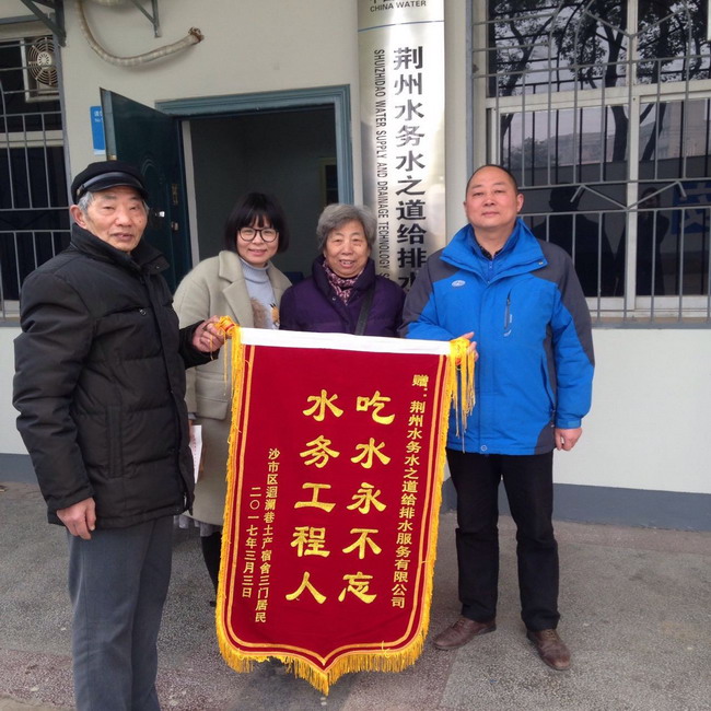 3月7日,沙市區(qū)迴瀾巷土產(chǎn)宿舍的老人們將一面“吃水永不忘水務(wù)工程人”的錦旗送到了荊州水務(wù)集團(tuán)水之道給排水技術(shù)服務(wù)公司,感謝他們學(xué)習(xí)雷鋒做好事,為民排憂解難題。