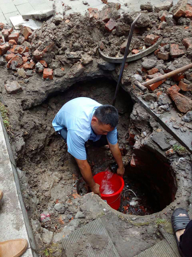 下午14:10,搶修一班趕到現(xiàn)場(chǎng),經(jīng)過(guò)走訪(fǎng)后了解后,班長(zhǎng)洪震制定了解決方案,隨后大家兵分兩路:一組在壓低區(qū)域內(nèi)部測(cè)壓,一組勘查外圍供水主管壓力。經(jīng)過(guò)測(cè)壓,發(fā)現(xiàn)內(nèi)網(wǎng)與外網(wǎng)存在有0.04mpa的壓力差。但現(xiàn)場(chǎng)并未發(fā)現(xiàn)管漏的痕跡,具體的管漏點(diǎn)在哪?只有一段一段在路面勘測(cè)打孔來(lái)排查。此時(shí)正值酷暑的正午,搶修班的隊(duì)員們頂著烈日,在路邊街道旁對(duì)閘門(mén)、水表等供水設(shè)施一一仔細(xì)排查,不放過(guò)任何疑點(diǎn)。功夫不負(fù)有心人,終于在連續(xù)排查2個(gè)多小時(shí)后,在塔橋路建行門(mén)口處的下水窨井內(nèi)發(fā)現(xiàn)有清水涌出,經(jīng)過(guò)開(kāi)挖確認(rèn)是DN150mm的管漏,正是這處暗漏造成了該片區(qū)的小區(qū)居民壓力偏低。