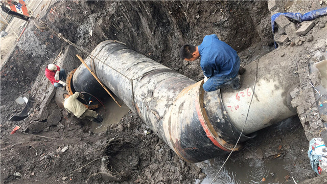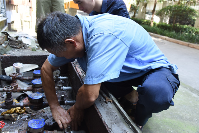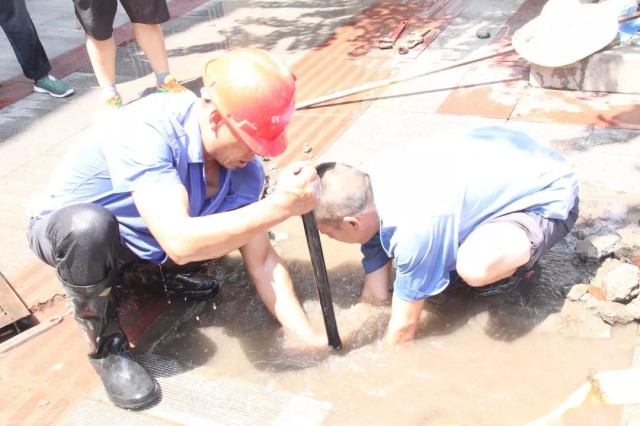 受熱脹冷縮的影響,供水水管在極端天氣下十分容易出現(xiàn)滲漏現(xiàn)象。此時,湯伯仲師傅正在丹鳳小區(qū)解決一處表前接頭漏水。他蹲在表井,正在用手一塊一塊的清理著磚渣瓦片,問他為什么不戴上手套,他的回答是戴手套太慢了,還有幾處類似的管漏在等著維修。清理過后,他又與同伴配合,僅僅十來分鐘就麻利而又快速的完成了維修,而小編這時看到,不但他們的衣服已經(jīng)被汗水濕透,而且他們的雙手因為常年勞做,早已布滿老繭和傷口。此時已經(jīng)臨近中午,但湯師傅和同事們也顧不上吃飯,就又匆忙的趕向下一處搶修地點。