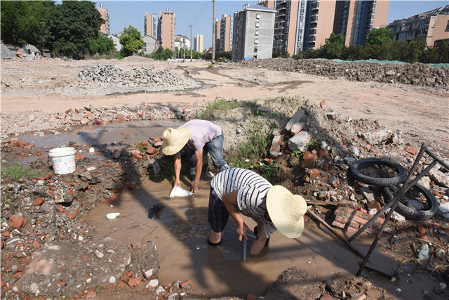 由于拆遷導致多處水管被挖破,荊州區(qū)首輔路水管斷裂處水柱噴涌而出,而旁邊就是高壓變壓器,情急之下,搶修工人鄧克兵直接用自己的雙腳堵住了水管裂口。炎炎烈日下,鄧師傅一站就是半個多小時,汗水順著頭發(fā)成線的往下滴。由于攜帶的小型抽水泵出現(xiàn)了故障,為了排除積水及時完成搶修,工人師傅們只能一桶一桶的提,每個人都已渾身濕透,分不清是水還是汗。夏季用水量大,像這樣的搶修一天有十多起,幾乎是從早忙到晚,一干就是十來個小時。