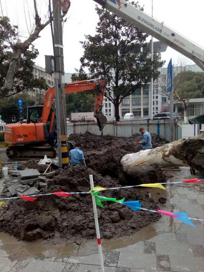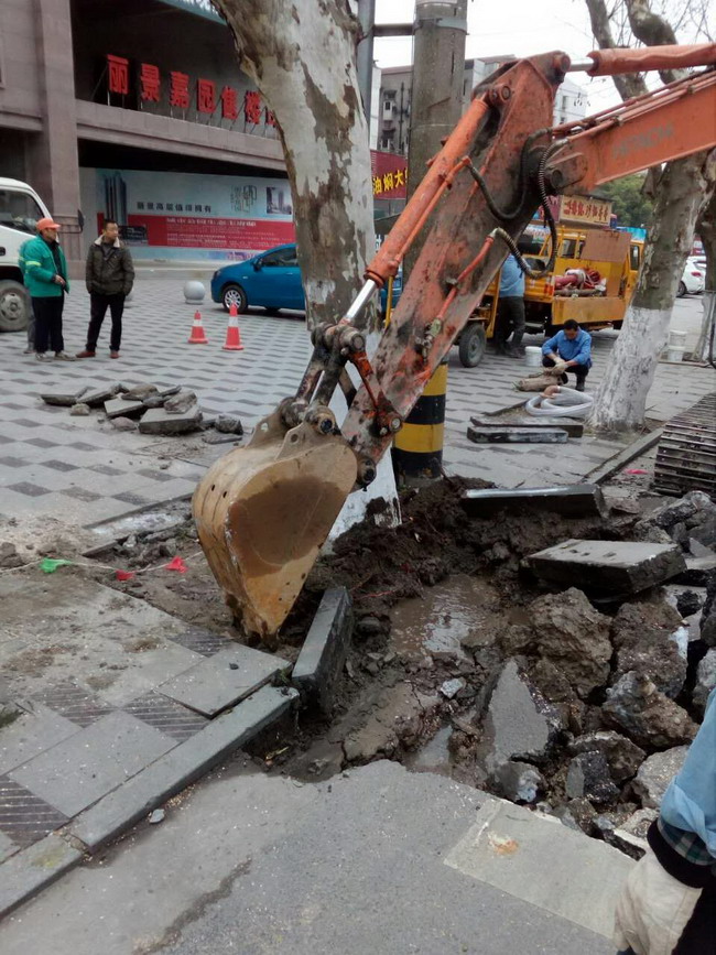 3月6日上午8:00,在大型維修車輛、設(shè)備人員充分準(zhǔn)備就緒后,維修施工正式開始。根據(jù)施工方案,首先要移除滲漏管道上方的大型景觀樹和電線桿,在相關(guān)部門人員的大力協(xié)助下,僅用時(shí)一小時(shí)就完成了“障礙”移除工作,接著大型挖機(jī)進(jìn)場破路施工,在找到漏點(diǎn)以后,管網(wǎng)維修人員嫻熟的拿上施工裝備下到潮濕的施工坑有條不紊的開始施工,從上午8:00到下午17:00,經(jīng)過近9小時(shí)的連續(xù)作業(yè),維修工程順利完成。經(jīng)過測壓觀察,壓力一切正常,在晚間高峰用水時(shí)段前恢復(fù)了供水。