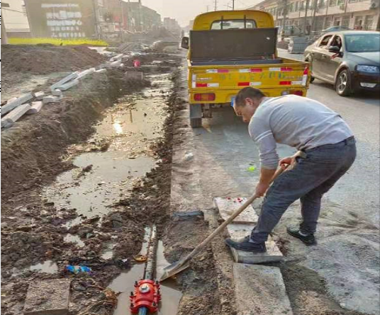 到達現(xiàn)場后,搶修人員立即開始排查,發(fā)現(xiàn)漏水原因是某單位施工導致公路南DN40主管道漏水。為了讓周邊居民做好儲水準備,搶修人員通知各區(qū)域經(jīng)理立刻發(fā)布停水通知。