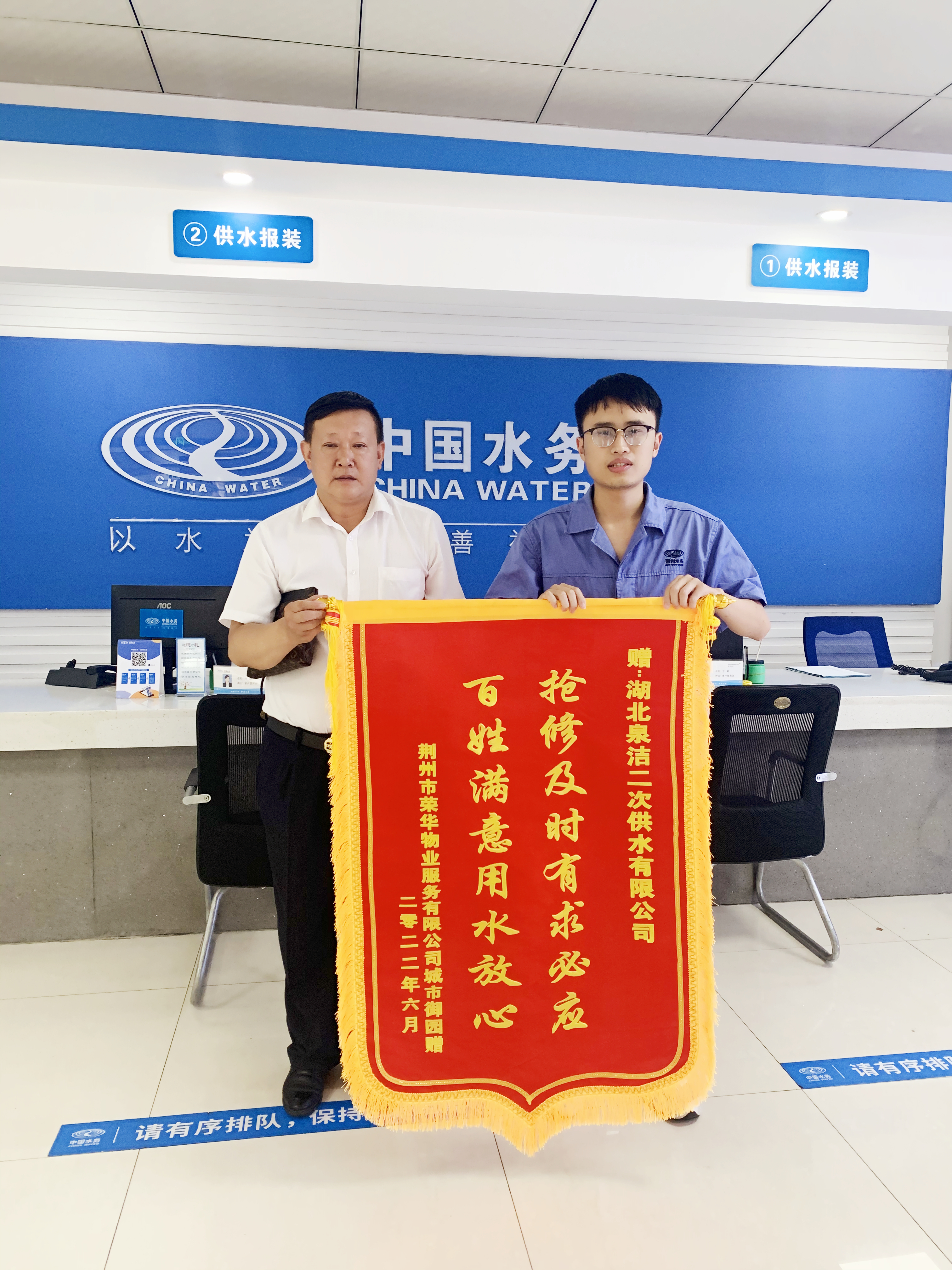 就在昨日,城市御園小區(qū)荊州市榮華物業(yè)負(fù)責(zé)人到荊州水務(wù)集團(tuán)南湖客戶服務(wù)中心贈(zèng)送了一面“搶修及時(shí)有求必應(yīng),百姓滿意用水放心”的錦旗,以對(duì)湖北泉潔二次供水工程有限公司維修故障到位,保障供水及時(shí)表示由衷的感謝,簡(jiǎn)短的十六個(gè)字,飽含了用戶濃濃的謝意,也是對(duì)供水人工作的充分認(rèn)可。