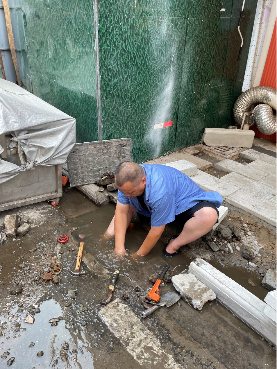 水質(zhì)渾濁,肉眼根本無(wú)法看清水下的具體情況,他憑借著多年維修的經(jīng)驗(yàn),俯下身軀,僅憑雙手在水中摸索,很快,他就把閥門維修完畢,來(lái)水端已可正常開(kāi)閉。這時(shí),圍觀居民們才看到他全身已被泥水打濕,緊緊的貼在身上,雙腳踩在泥水里,整個(gè)人仿佛被泥水洗了一遍。