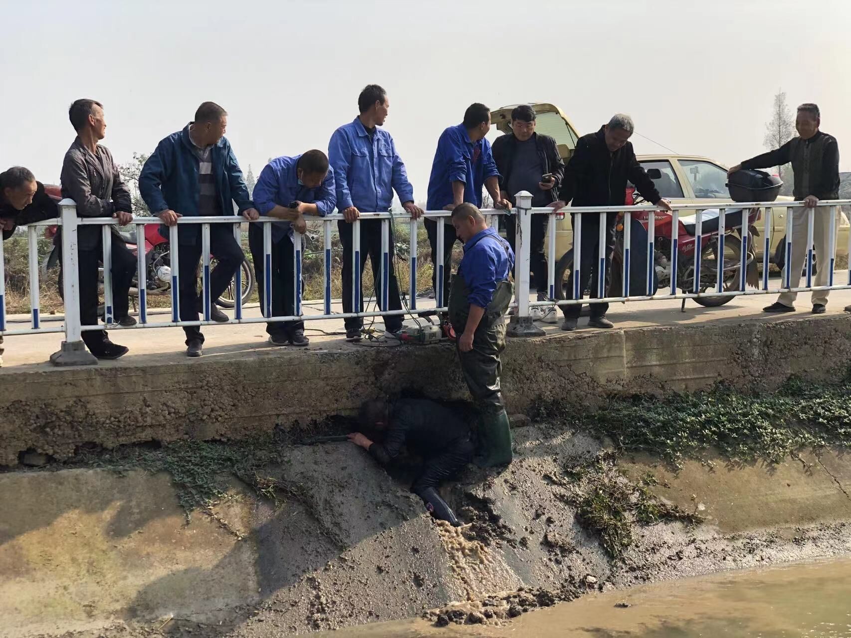 站長(zhǎng)朱宜華帶上幾名維修師傅到現(xiàn)場(chǎng)查看,發(fā)現(xiàn)管道在近60厘米的商混路面以下,靠人工破路向下挖鑿難度極大,若請(qǐng)用挖機(jī)則自然增加了維修成本,現(xiàn)場(chǎng)經(jīng)過(guò)大家商量,決定從路面?zhèn)确接蔑L(fēng)鎬機(jī)人工挖鑿。由地面保護(hù)人員將楊敏師傅用安全繩系好后,站在溝渠護(hù)坡上進(jìn)行操作,經(jīng)過(guò)近一小時(shí)的捶打終于挖出了管網(wǎng)漏點(diǎn),然后由身形相對(duì)瘦小的盛師傅鉆進(jìn)洞里進(jìn)行了管道維修處理。