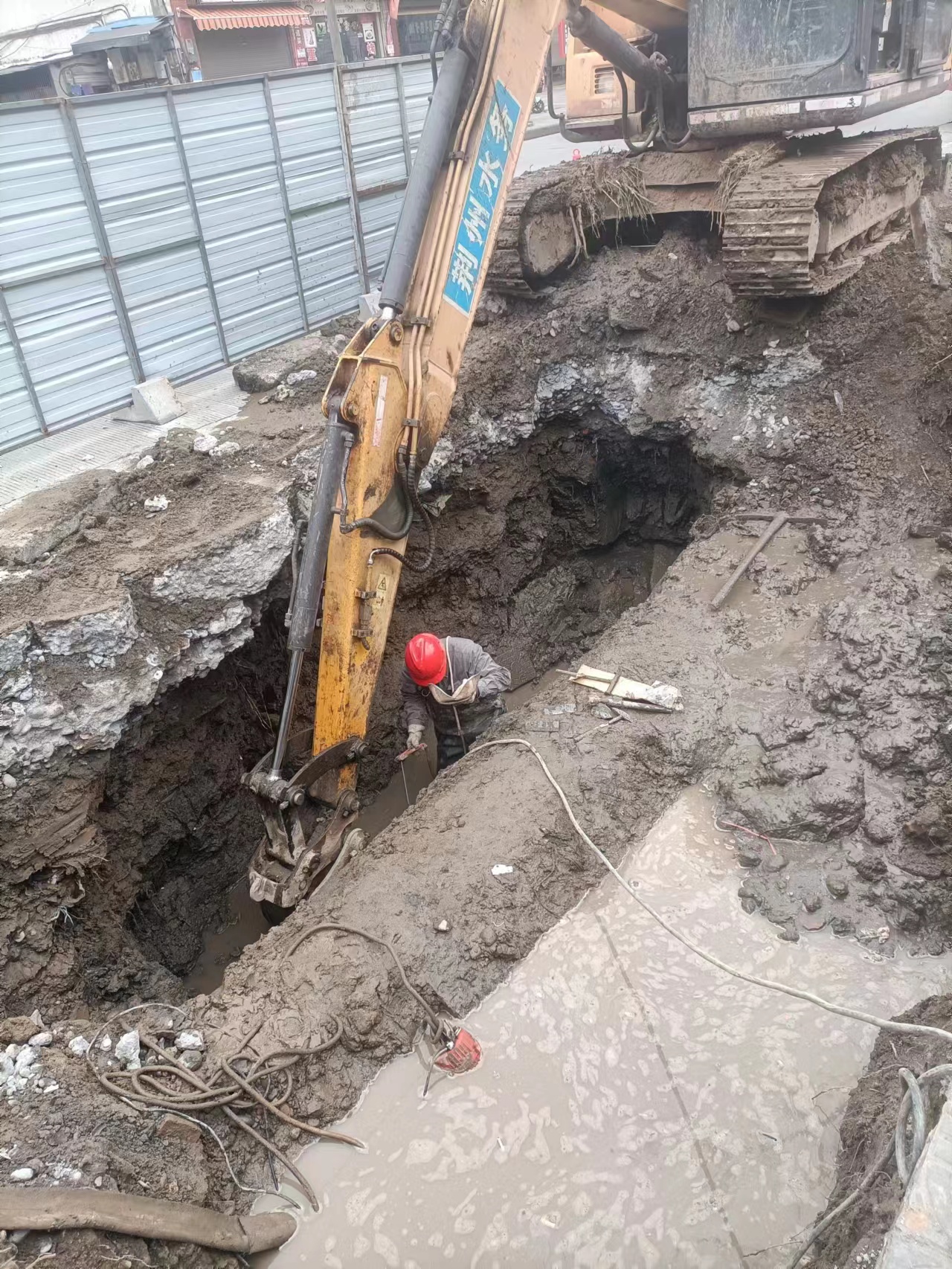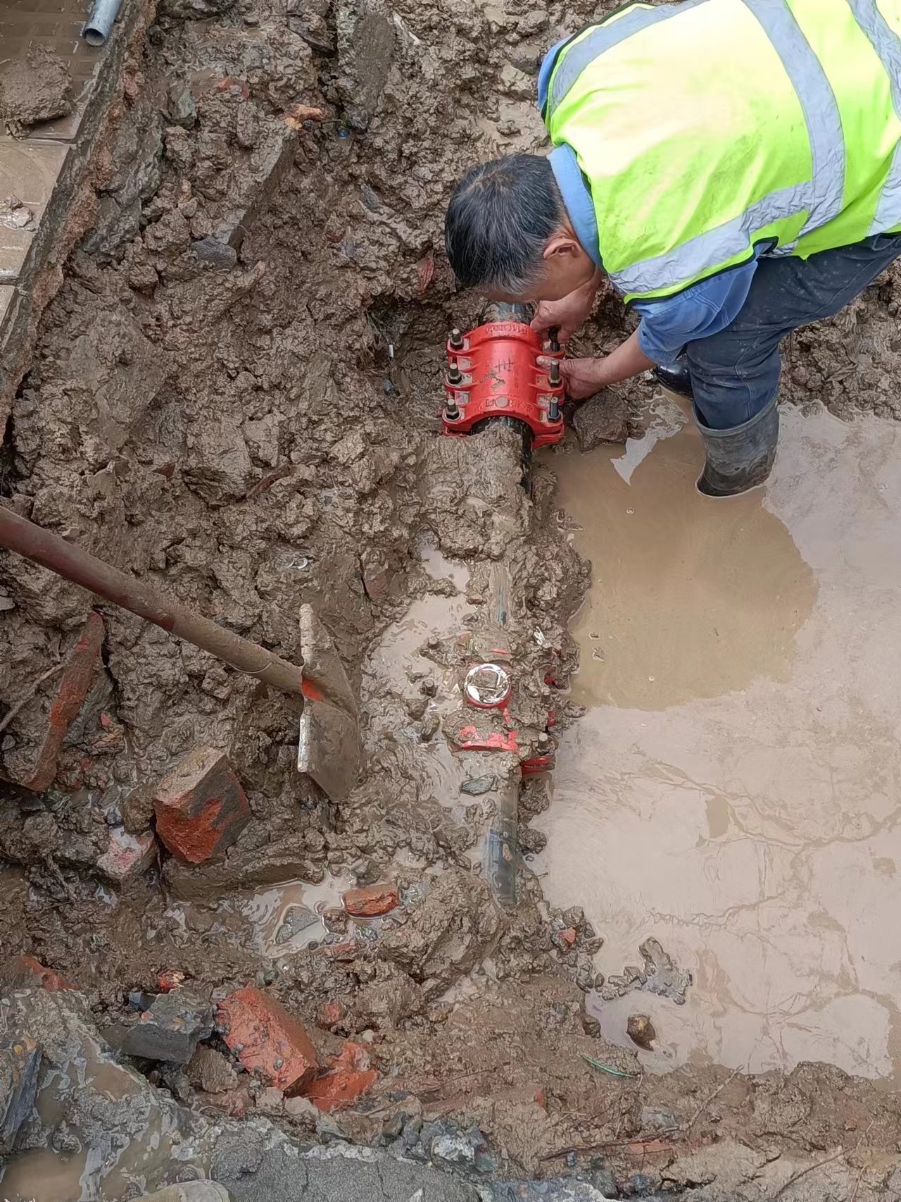 3月27日上午8點,在大型維修車輛、設備人員充分準備就緒后,維修施工正式開始。根據施工方案,首先要移除滲漏管道上方的綠化帶,接著大型挖機進場破路施工,在找到漏點以后,管網搶修隊員員嫻熟的拿上施工裝備下到滿是污水的施工點有條不紊的開始施工流程,從上午8點到下午4點,經過近8小時的連續(xù)施工,這個困擾大家多日的“難題”終于得以解決。經過測壓觀察,壓力一切正常。并在晚高峰之前,燎原路路這一路段恢復了供水,本次維修施工也得以順利完成。