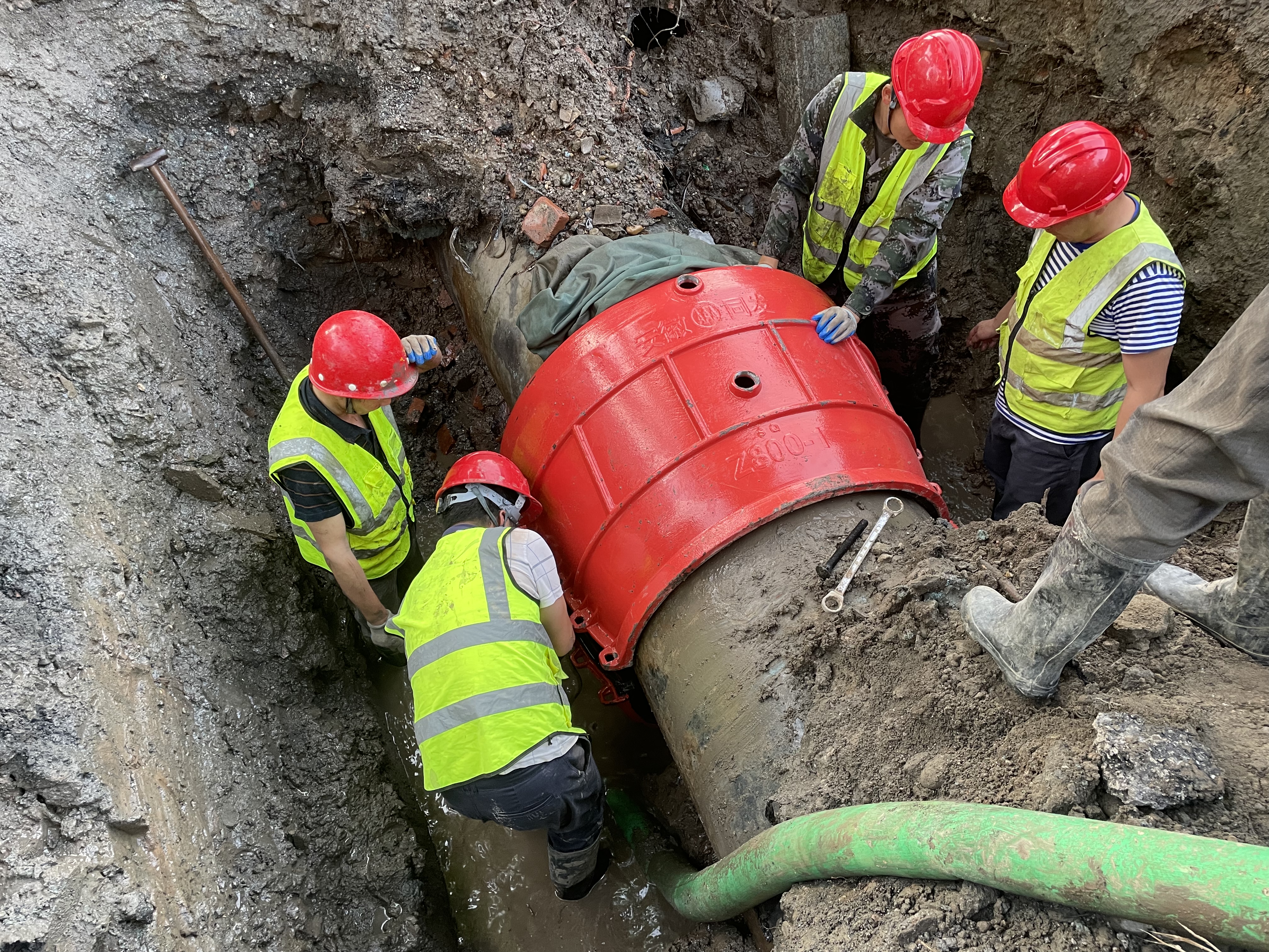12日下午3點(diǎn),一切準(zhǔn)備就緒后,維修人員嚴(yán)格按照《管網(wǎng)維修施工流程》展開維修。在大型機(jī)械的協(xié)助下,他們對管漏點(diǎn)進(jìn)行定點(diǎn)破路開挖,漏點(diǎn)在路面下方被準(zhǔn)確找到,確認(rèn)是因?yàn)楣艿老鹉z老化造成的管漏。隨即搶修隊(duì)員輪流下到施工坑下方進(jìn)行切割、綁卡子、擰螺栓,每一個(gè)環(huán)節(jié)都一絲不茍。但因?yàn)楣艿揽趶捷^大,給施工帶了不少難度,施工坑下面泥濘不堪,搶修隊(duì)員身上、臉上全是污泥汗水,他們也全然不顧,一心只想著早點(diǎn)完成搶修任務(wù)通上水,連晚飯也沒來得及吃上一口。