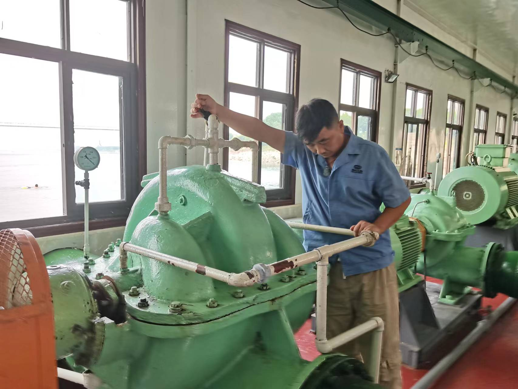 6月17日早上7點08分,正值節(jié)假日用水早高峰時段,南湖水廠取水泵船值班員在巡檢時發(fā)現(xiàn)取水4號機組逆止閥處閥體左側(cè)有大量水噴濺,為確保水泵電機安全,在通知廠部后值班人員及時關(guān)停了4號機組和水泵進出口閥門。