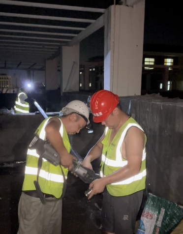 鼎鑫源工程公司接到施工任務(wù)后緊密與校方溝通,結(jié)合校方要求對(duì)施工方案反復(fù)討論、優(yōu)化確定后,迅速組織人員材料進(jìn)場。正值三伏暑期,最高溫度直逼40℃,面對(duì)高溫天氣和緊急的工期,項(xiàng)目部科學(xué)統(tǒng)籌、靈活安排時(shí)間,避開酷熱午間,選擇在清晨及夜間施工,確保高溫天氣下“勞動(dòng)力不流失、進(jìn)度不滯后、安全不放松”。盛夏的白天是炙熱的,夜晚的工作是熱烈的,時(shí)間雖已到傍晚,但現(xiàn)場作業(yè)的施工員們?nèi)员3种值木珰馍瘢踩薄⒎垂夥?、安全繩、探照燈,在保證安全的前提下大家井然有序地加快著手中的動(dòng)作,一心只為項(xiàng)目盡早落地。