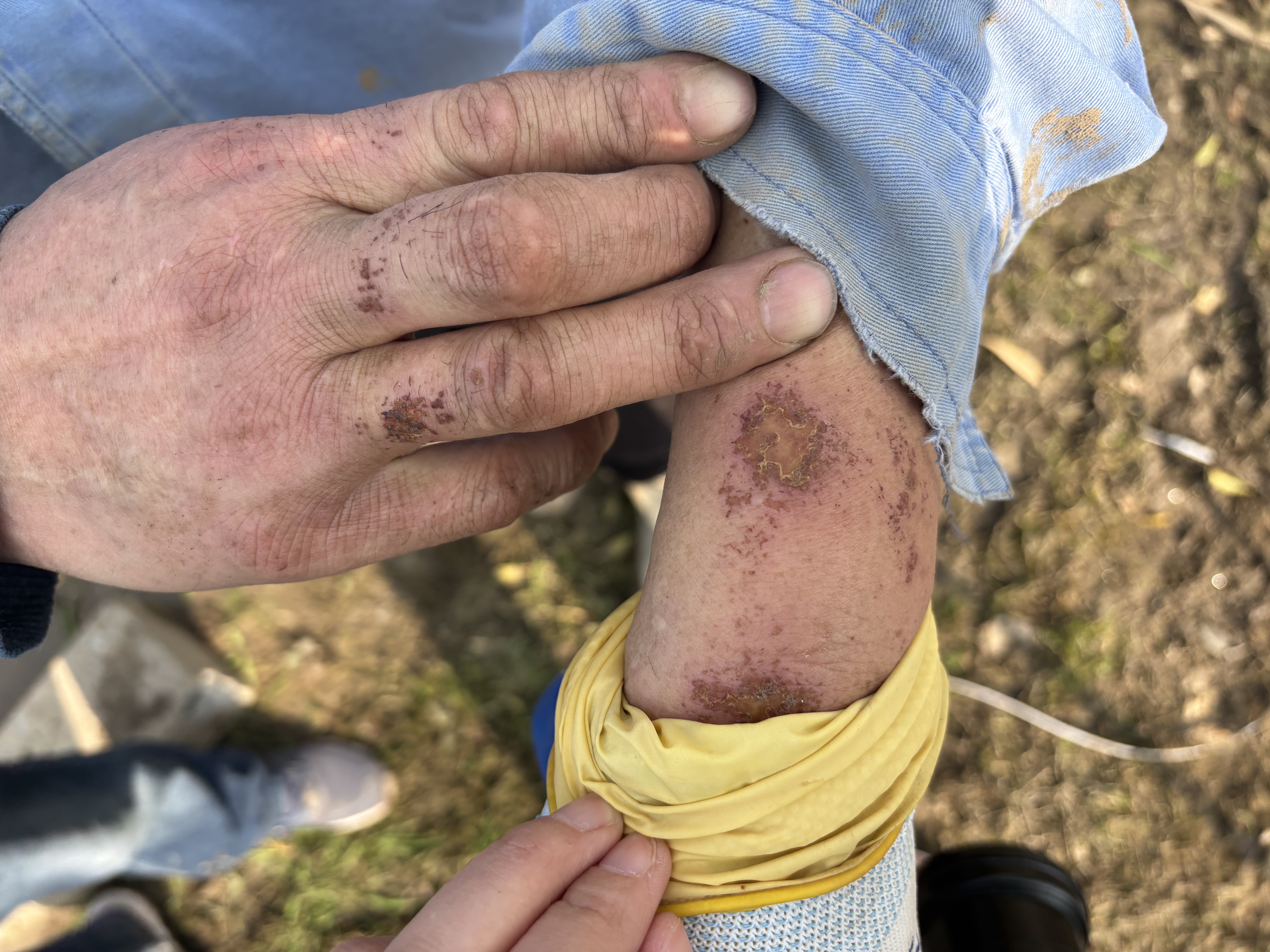 這雙手的主人是荊州水務(wù)集團(tuán)管網(wǎng)部搶修員黃發(fā)均,57歲的黃師傅已經(jīng)在管網(wǎng)部有25年的工齡了,1月21日在沙岑路DN600供水主管的搶修工作中,由于管道搶修劑具有腐蝕性,即使全程戴著手套作業(yè)也難免被燒傷。