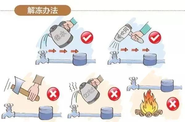 如水表、水龍頭、水管出現(xiàn)結(jié)冰現(xiàn)象,宜先用熱毛巾包裹水龍頭,澆溫水,使水龍頭解凍。隨后打開水龍頭,用溫水沿水龍頭慢慢向管子澆灑,使水管解凍。若澆水表處仍不見水流,則水表被凍住了。此時(shí),再用熱毛巾包在水表上,用溫水(不超過60攝氏度)澆淋,切勿澆沸水、用明火烘烤,以防水管、水表及水表玻璃爆裂。如不具備用溫水澆淋的條件,也可采用電吹風(fēng)烘吹。