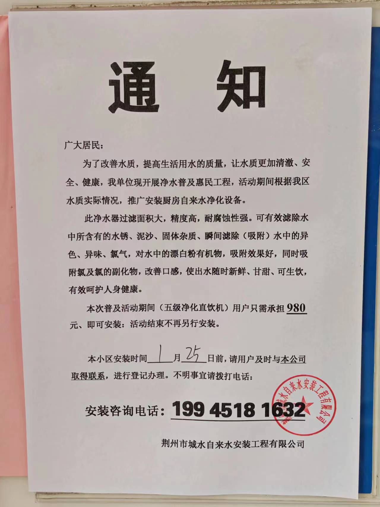 近日,我公司陸續(xù)接到多個(gè)小區(qū)和用戶(hù)反映,稱(chēng)署名“荊州市城水自來(lái)水安裝工程有限公司”,在各小區(qū)張貼了關(guān)于安裝“自來(lái)水凈化設(shè)備”的公告,該行為對(duì)廣大市民及用戶(hù)健康用水造成誤導(dǎo),也給我公司對(duì)外服務(wù)形象造成一定的影響。