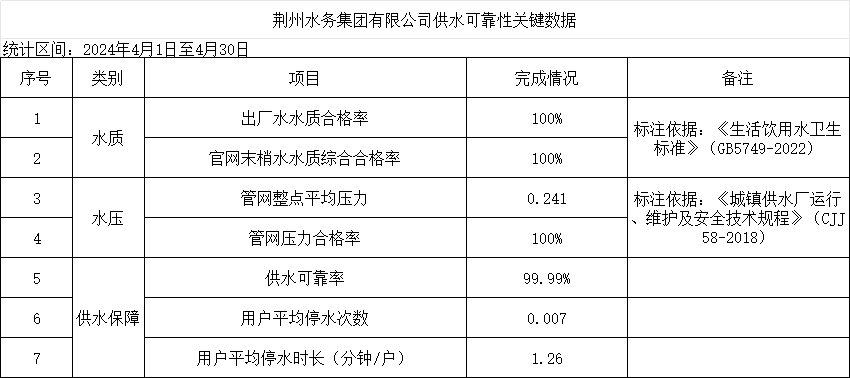 2024年4月荊州水務(wù)集團(tuán)有限公司供水可靠性關(guān)鍵數(shù)據(jù)