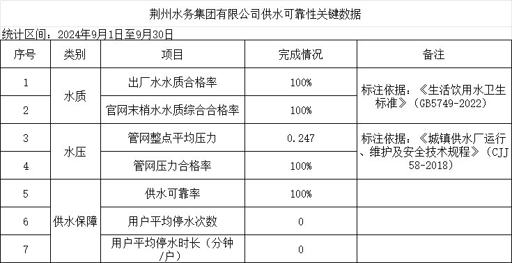 2024年9月荊州水務(wù)集團有限公司供水可靠性關(guān)鍵數(shù)據(jù)
