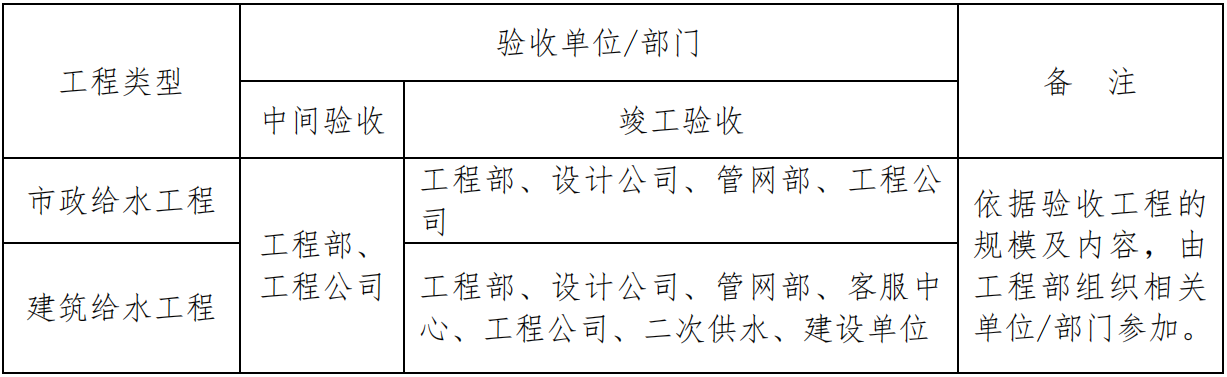荊州水務(wù)集團給水工程分市政給水工程(公司管網(wǎng)改造、新建工程)和建筑給水工程(立戶、分戶工程)。 工程驗收分中間驗收和竣工驗收。